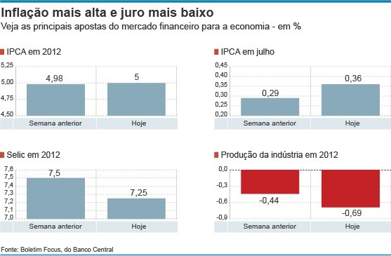 Apesar de projetar avanço na inflação este ano, o boletim Focus do BC vê juros mais baixos ao fim deste ano. A mediana das projeções para a taxa básica de juros, a Selic, apuradas pela autoridade monetária junto a mais de cem instituições para a taxa Selic caiu de 7,5% para 7,25% ao fim de 2012.